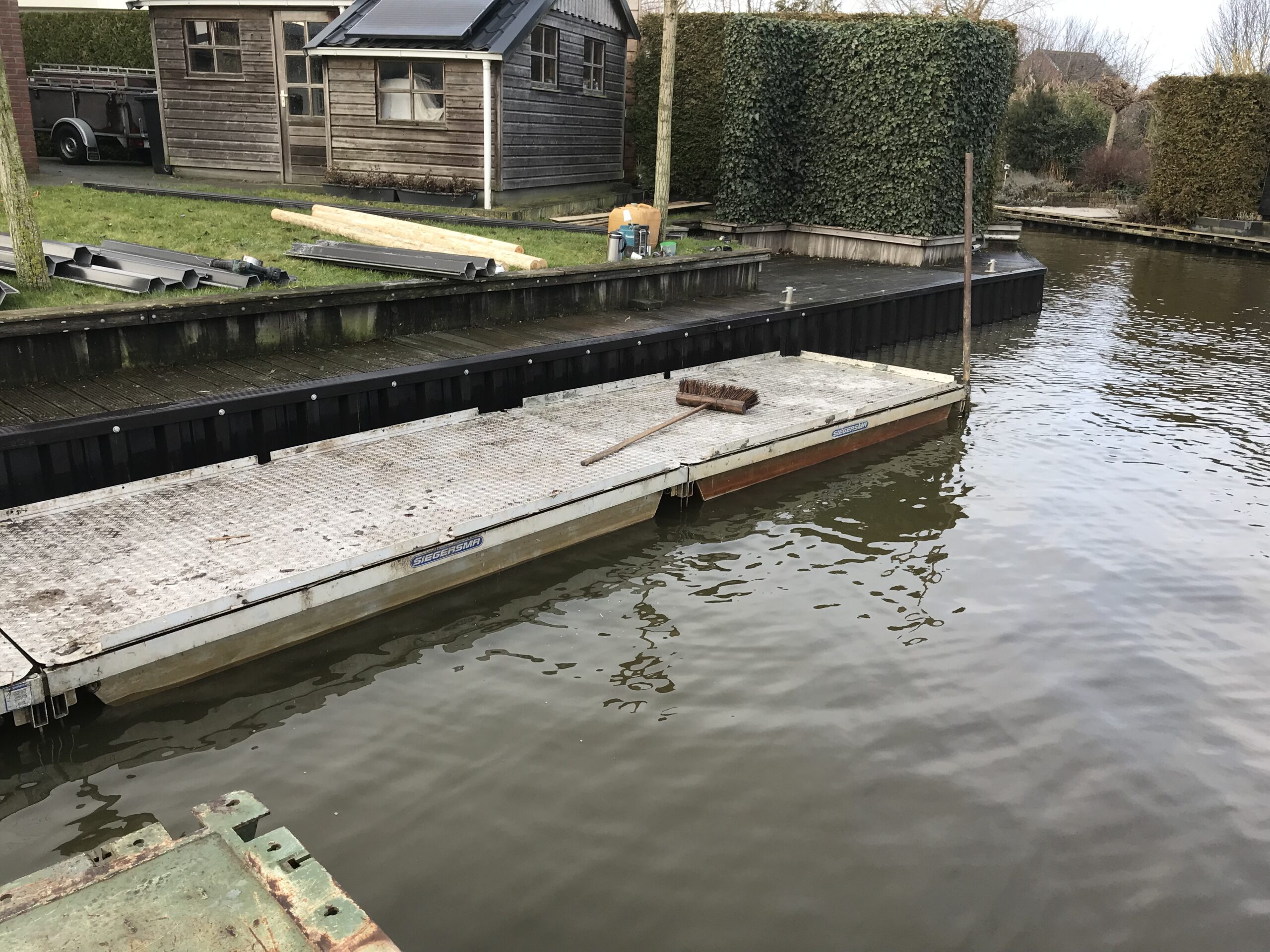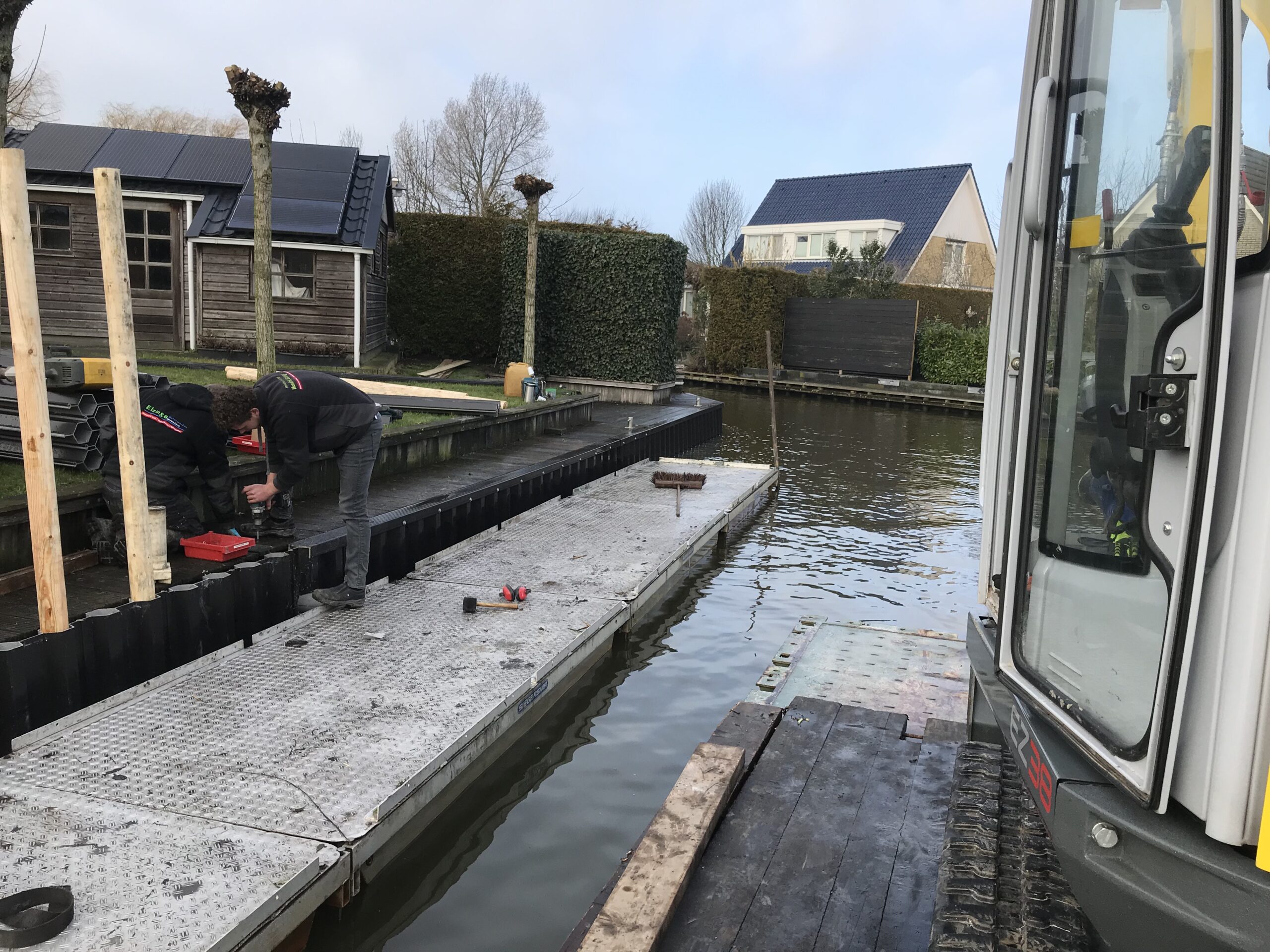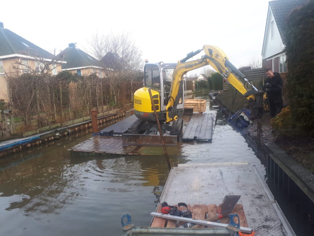 In Delfzijl zijn we voor dit project met ons materieel te water gegaan. De bewoners wilden duurzame kunststof walbeschoeiing, maar wel de bestaande tuin intact houden. Daarom zijn we via het water aan de achterzijde begonnen met het verwijderen van de oude houten beschoeiing.