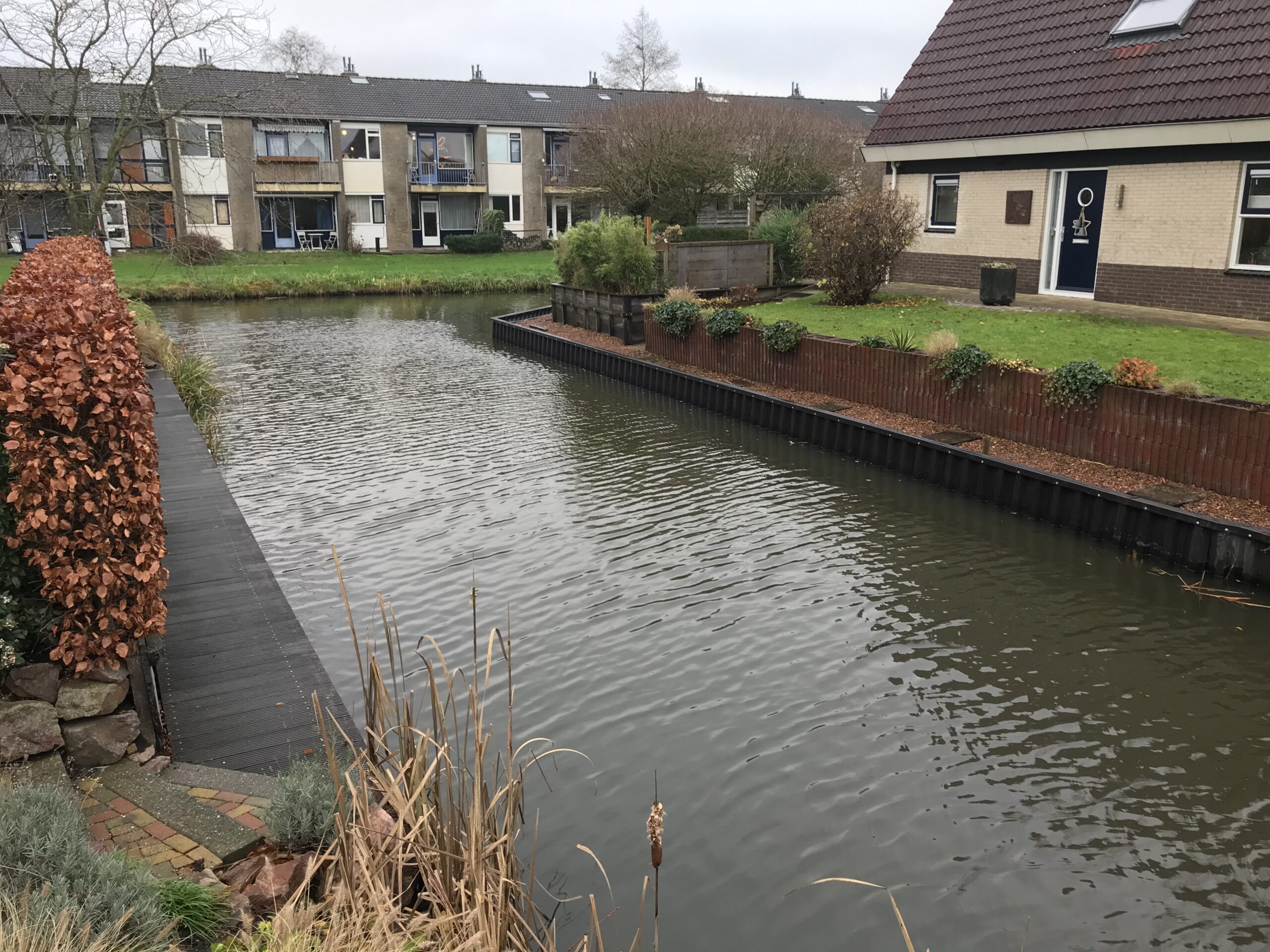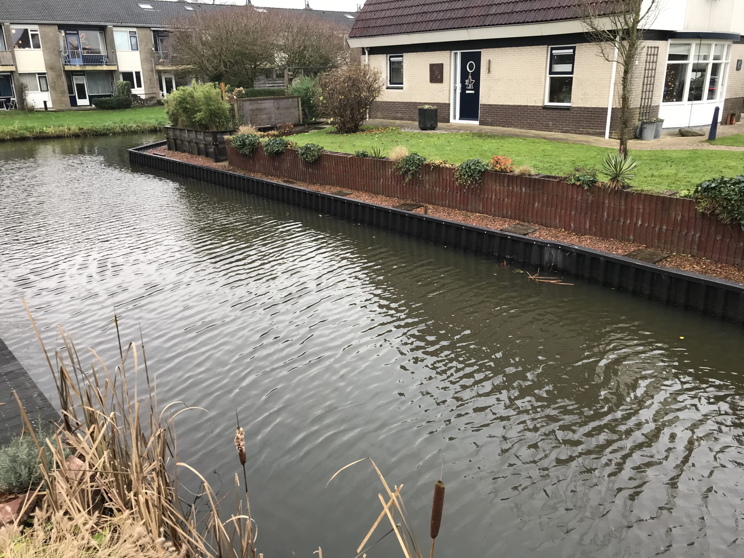 In Eelderwolde hebben we kunststof walbeschoeiing geplaatst, netjes vóór de oude beschoeiing. De bestaande beschoeiing was niet zo hoog, waardoor we hier geen ankers hoefden te gebruiken. Dat scheelt natuurlijk in de kosten en in werk. Deze kunststof walbeschoeiing in Eelderwolde is een handige oplossing als je waterkant nog prima staat, maar je wel onderhoudsvrij verder wilt.