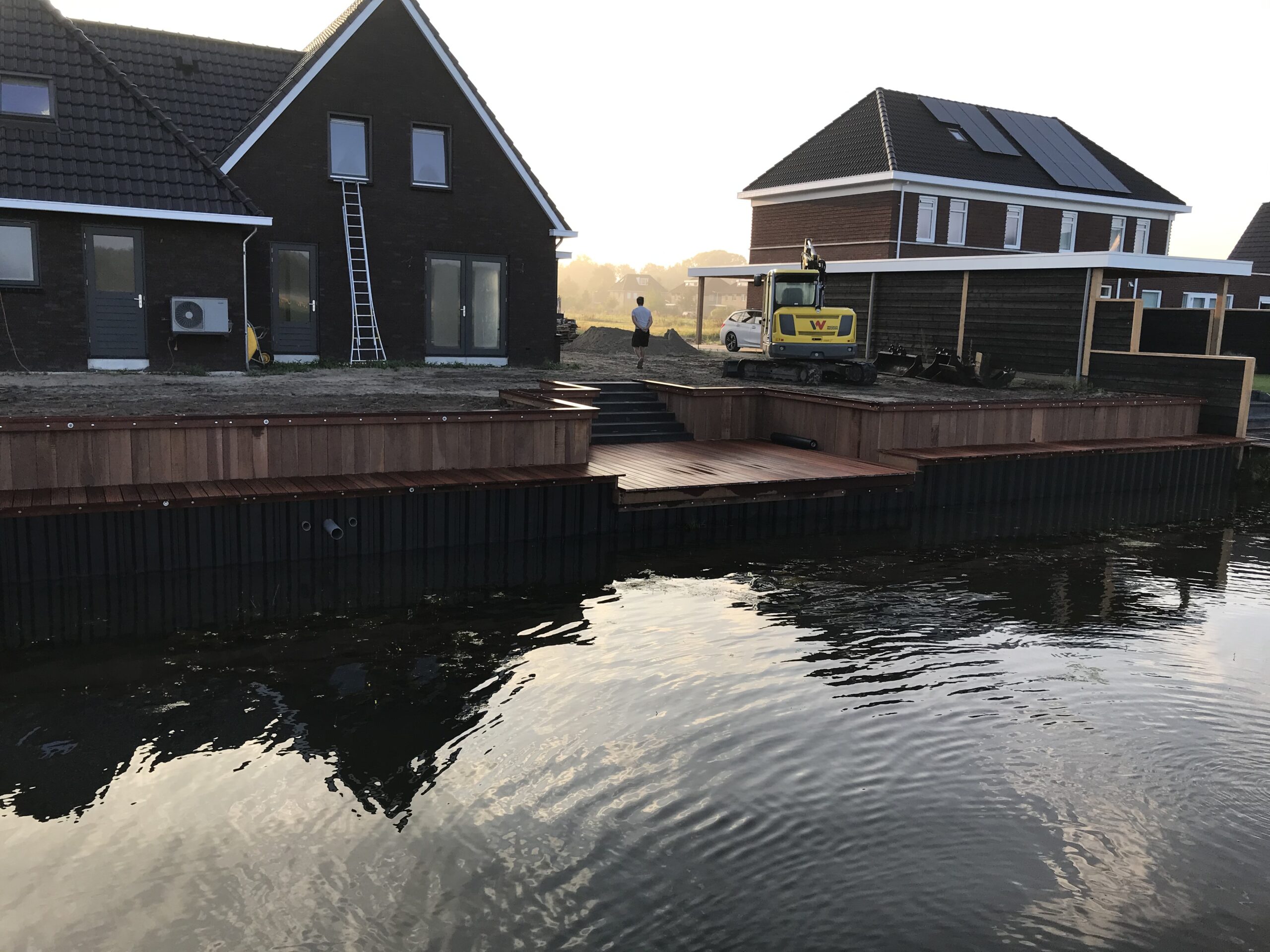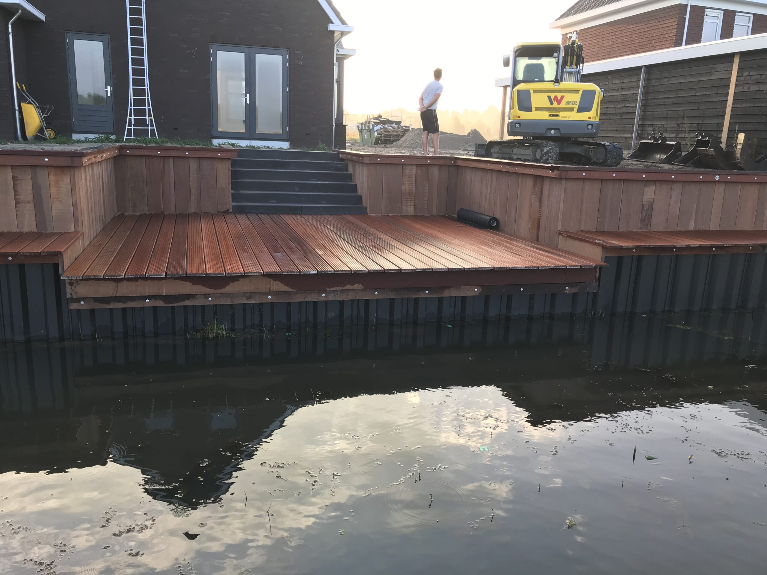 In Groningen hebben wij een kunststof walbeschoeiing geplaatst met een nette afwerking in hardhout. De strakke lijnen en het gebruik van duurzame materialen geven de tuin direct een moderne uitstraling. Dankzij de kunststof constructie is de walbeschoeiing onderhoudsarm en bestand tegen jarenlang contact met water.