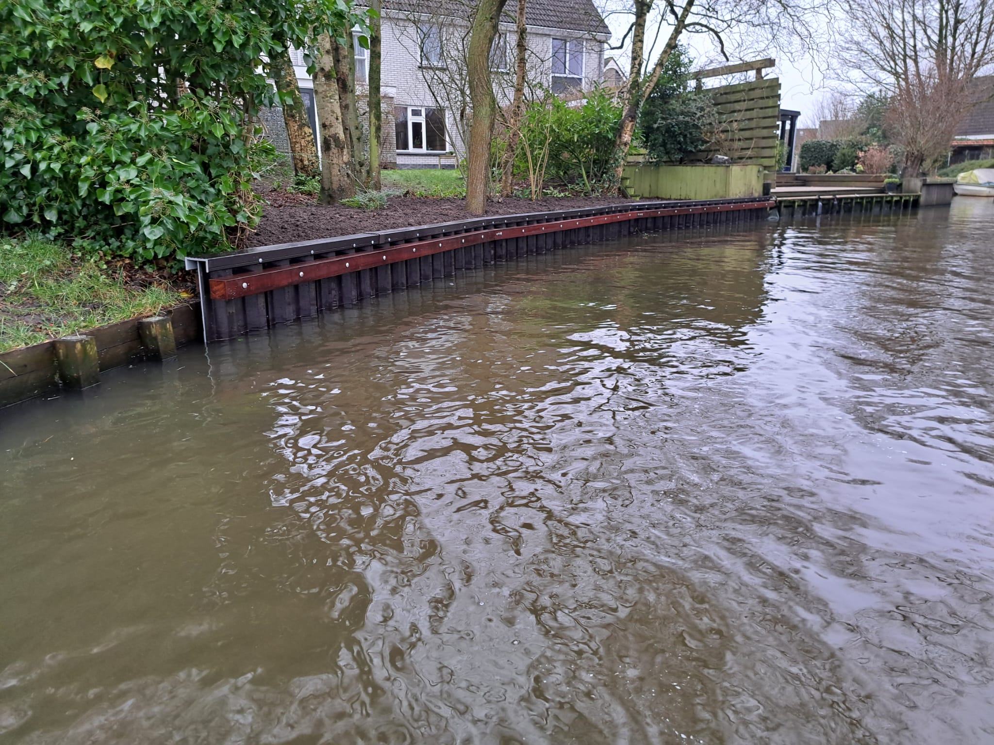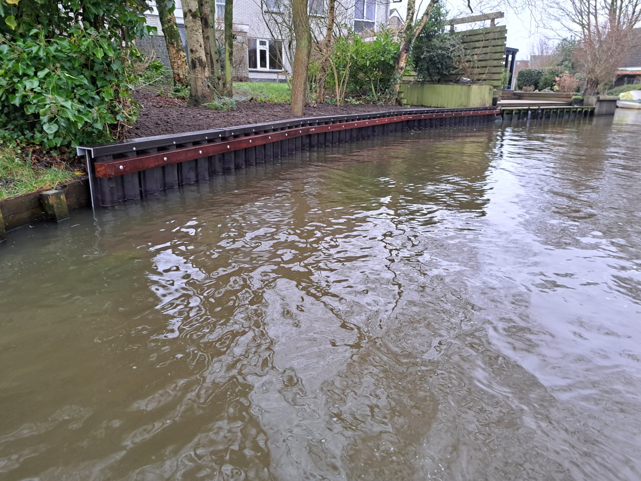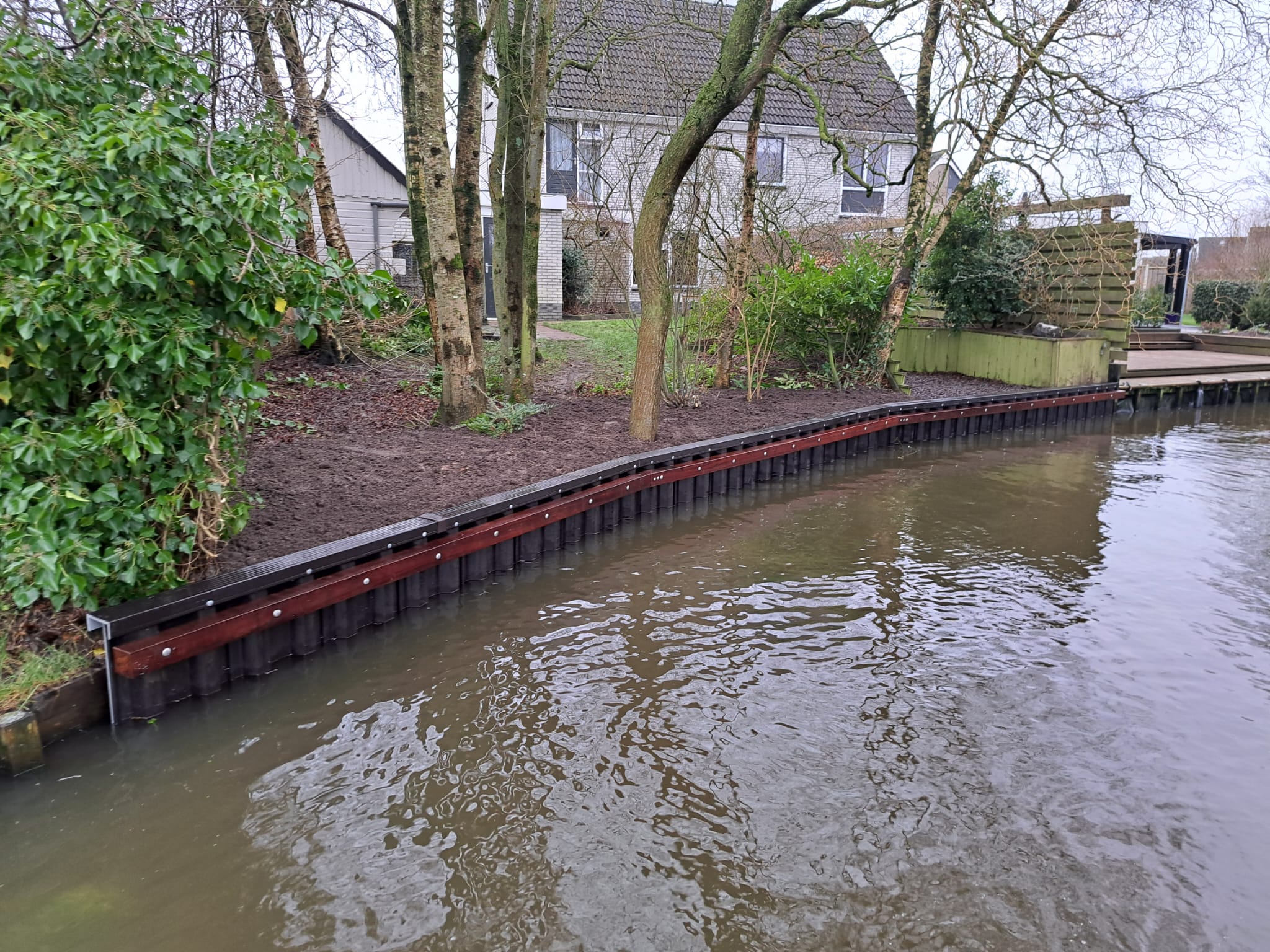 Door de kunststof walbeschoeiing te plaatsen is het perceel weer netjes afgewerkt en onderhoudsarm gemaakt, zodat de bewoners er jarenlang plezier van hebben.