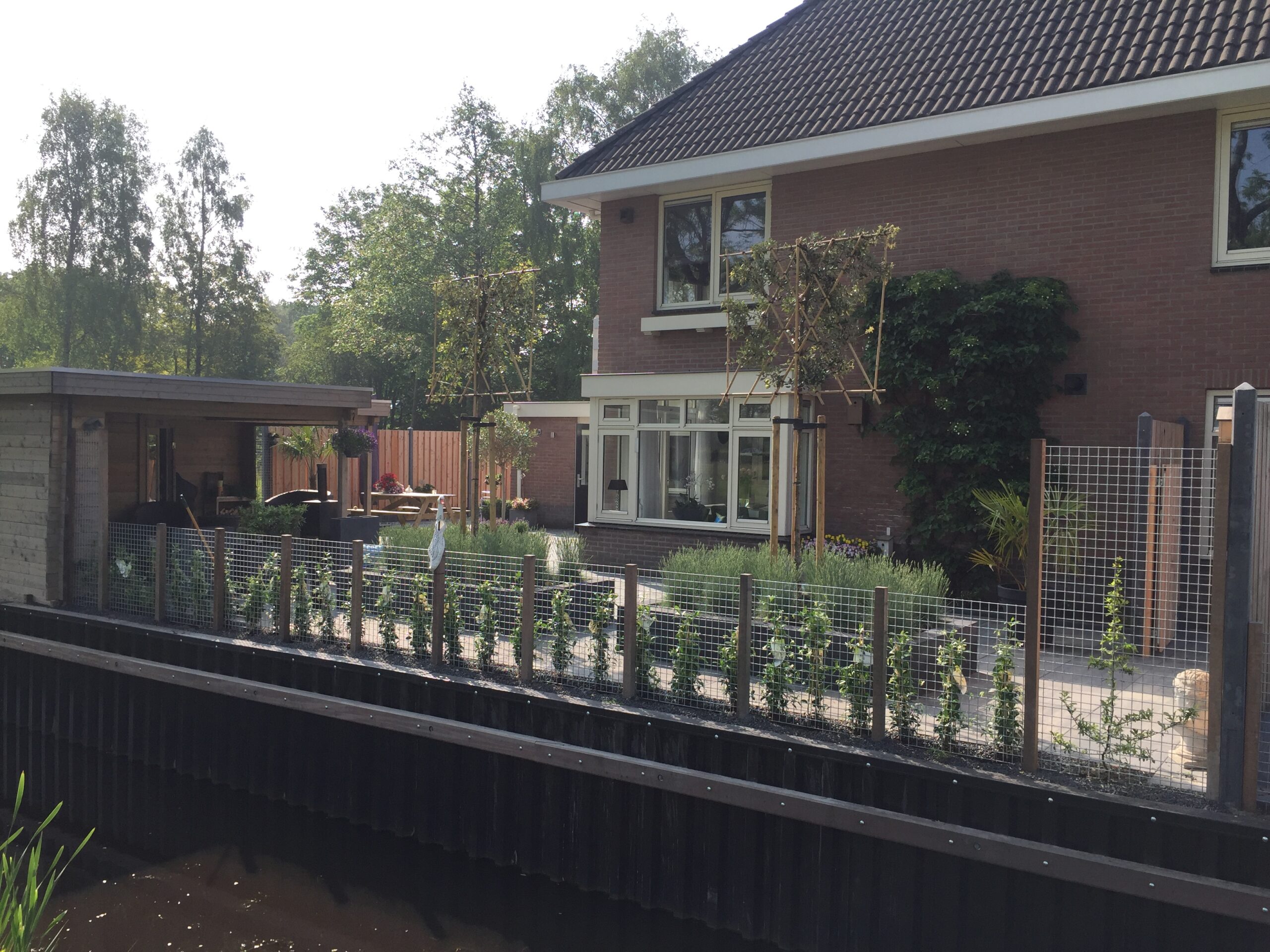In Heerenveen is een kunststof walbeschoeiing geplaatst, afgewerkt met een houten gording. Daarboven is een hekwerk met gaaspanelen gezet, waarlangs jonge beplanting kan groeien. De tuin is strak ingericht met terras en een moderne overkapping, waardoor er een onderhoudsvriendelijke en nette waterkant is ontstaan.