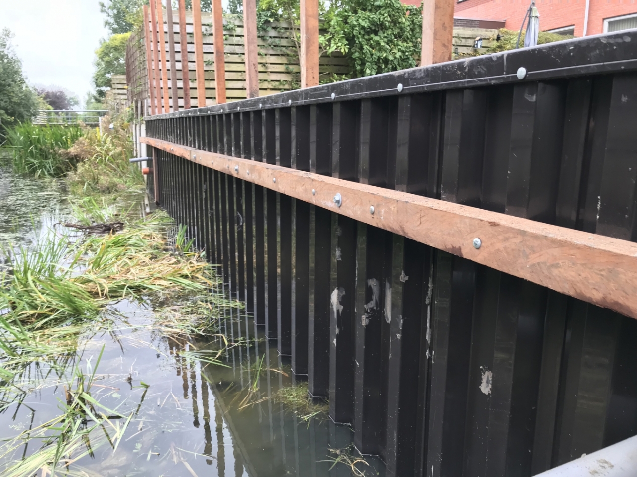 In Hoogkerk hebben wij een tuin voorzien van duurzame kunststof walbeschoeiing. De oude houten constructie was verzwakt en toe aan vervanging. Door te kiezen voor kunststof is de oever nu weer stevig en onderhoudsarm voor de komende tientallen jaren.
