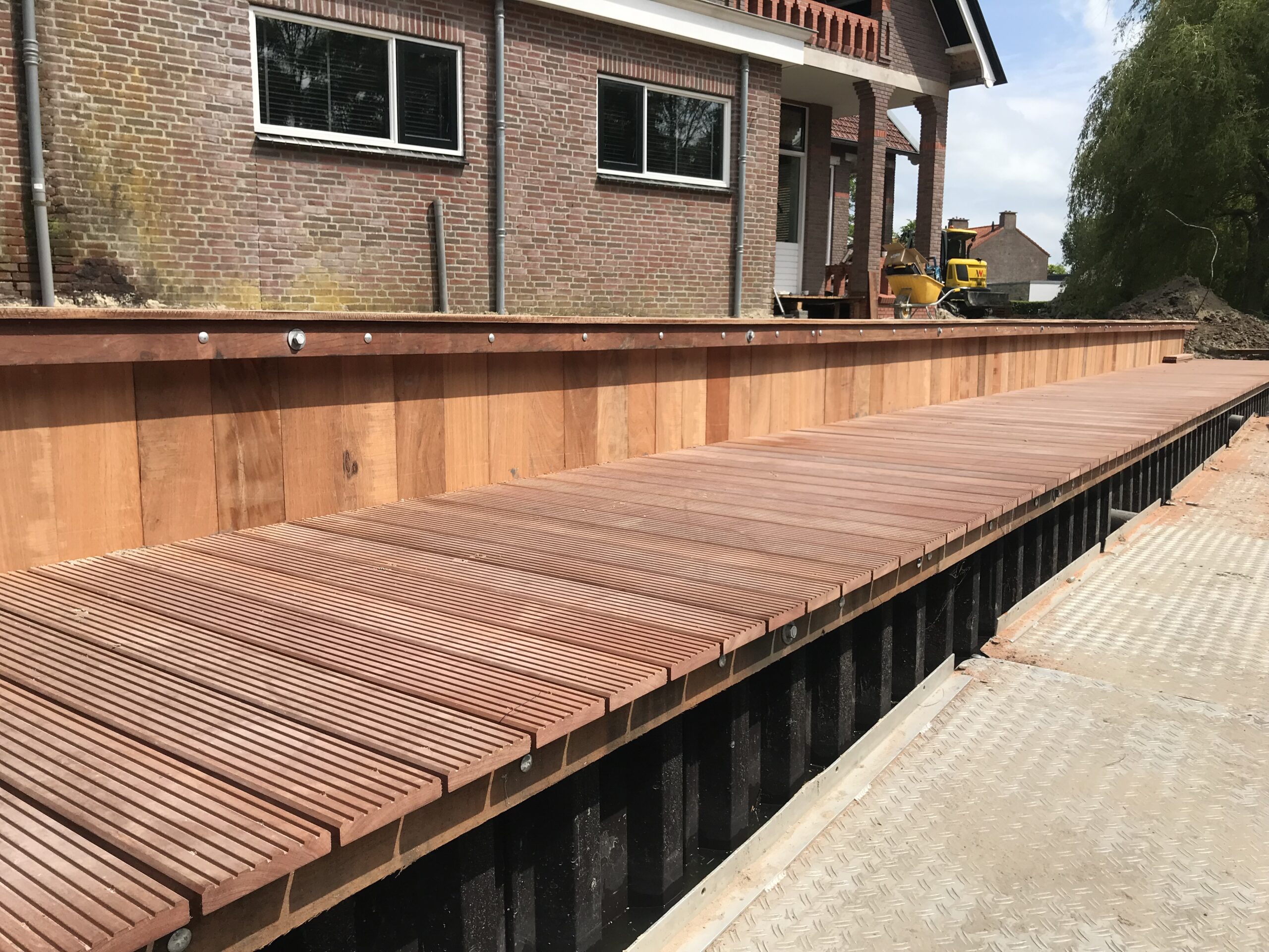 In Hoogkerk hebben we de hele slootkant langs een tuin voorzien van kunststof walbeschoeiing. We hebben daarbij gekozen om er een hardhouten vlonder en een hardhouten grondkering aan te leggen. Eerst hebben we de tuin leeggehaald en de oude beschoeiing weggehaald, zodat we schoon konden werken. Het meeste maatwerk hebben we in onze werkplaats al voorbereid. Dat scheelt tijd aan het water en zorgt dat je snel klaar bent.