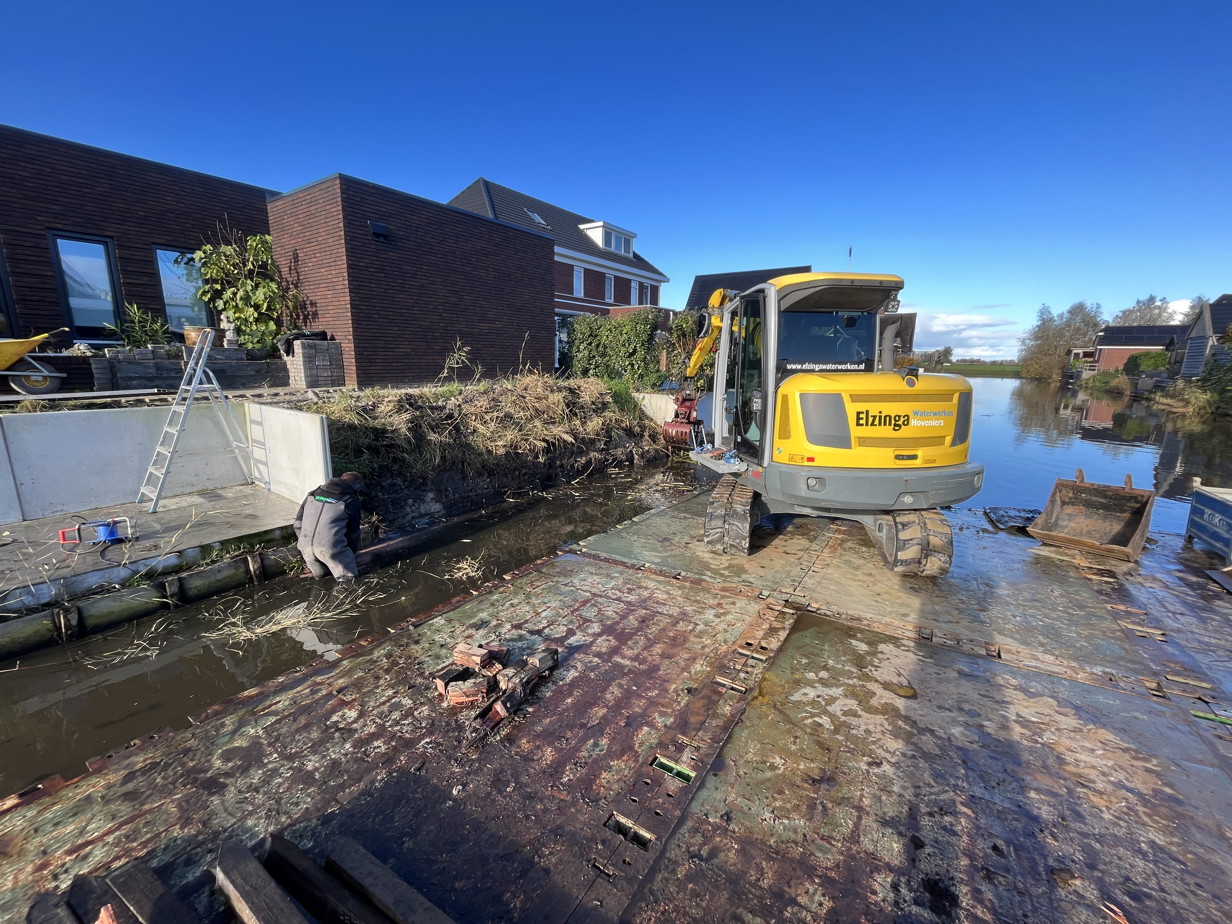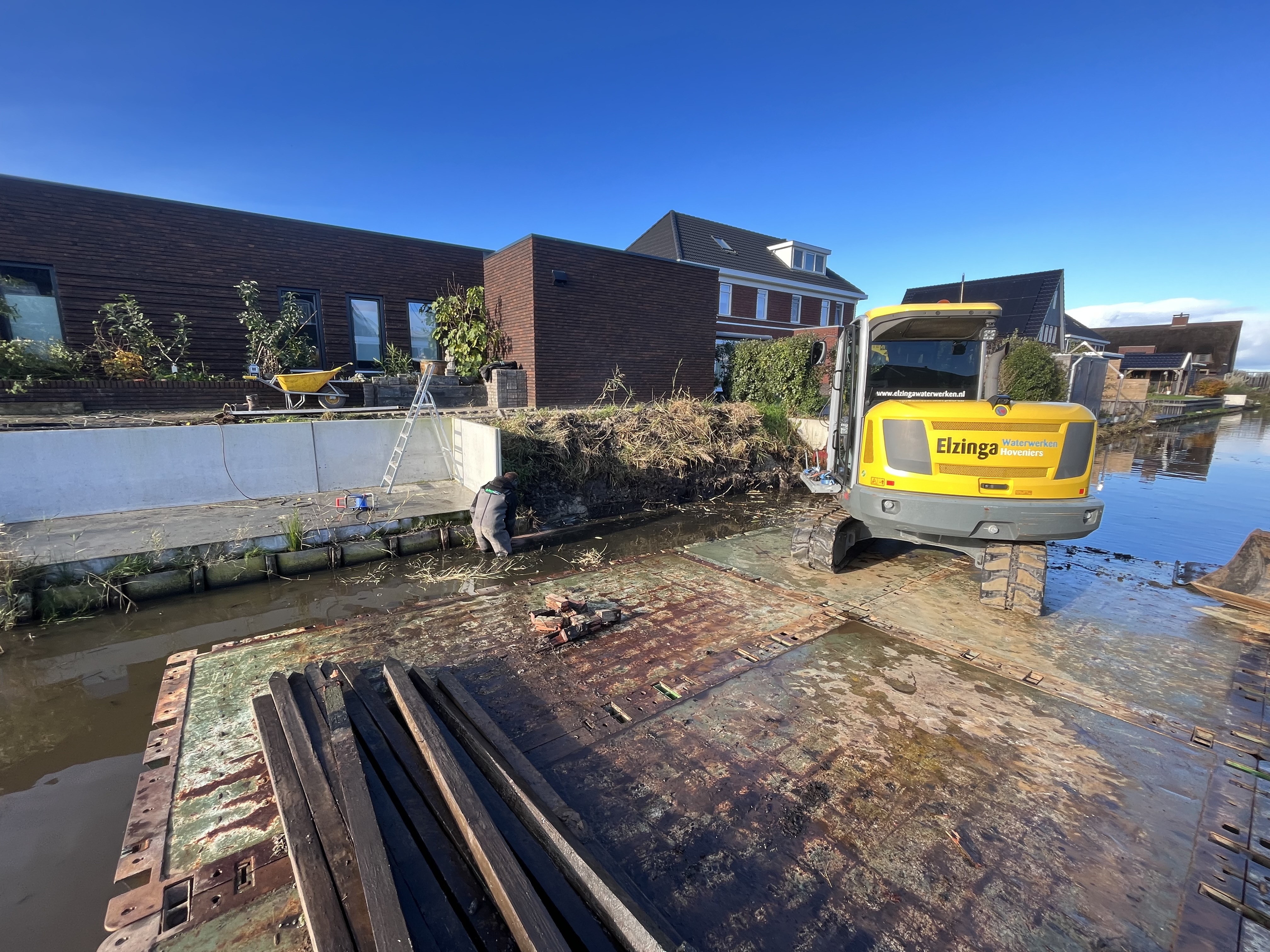 In Zuidhorn hebben wij recent een tuin voorzien van een nieuwe kunststof walbeschoeiing. De oude houten constructie was aan vervanging toe en maakte plaats voor een duurzame oplossing die minimaal 50 jaar meegaat. Om de werkzaamheden efficiënt en netjes uit te voeren, hebben wij gebruik gemaakt van werkpontons zodat de bestaande tuin intact kon blijven.