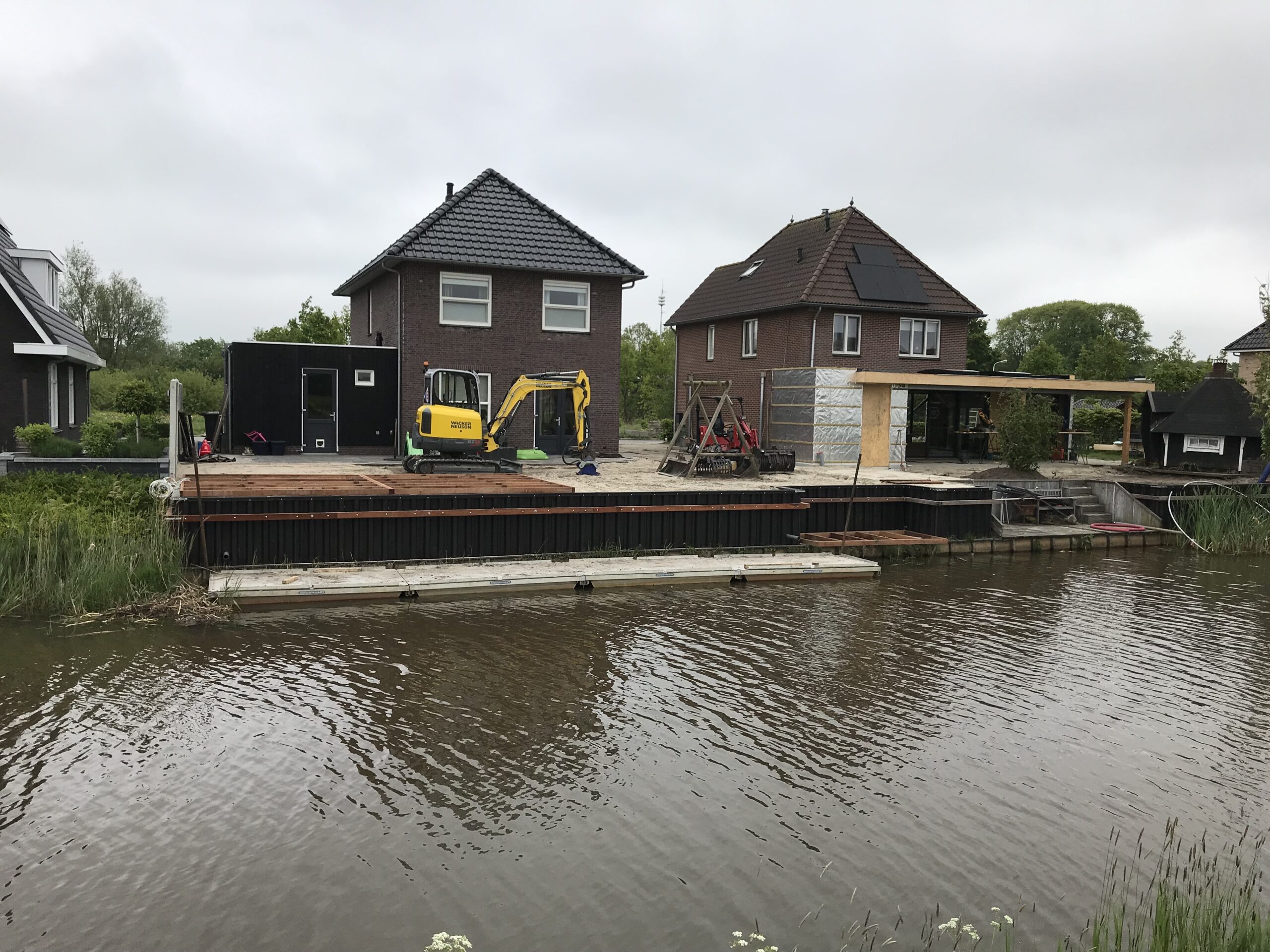 In Drachten hebben we de complete tuinaanleg en de walbeschoeiing verzorgd bij een klant. Er is gekozen voor een hoge kunststof walbeschoeiing, zodat de tuin tot aan de waterkant gebruikt kan worden. Om toch contact met het water te houden, hebben we een hardhouten vlonder geplaatst. Ideaal om een boot aan te leggen of gewoon te genieten van de natuur aan het water.