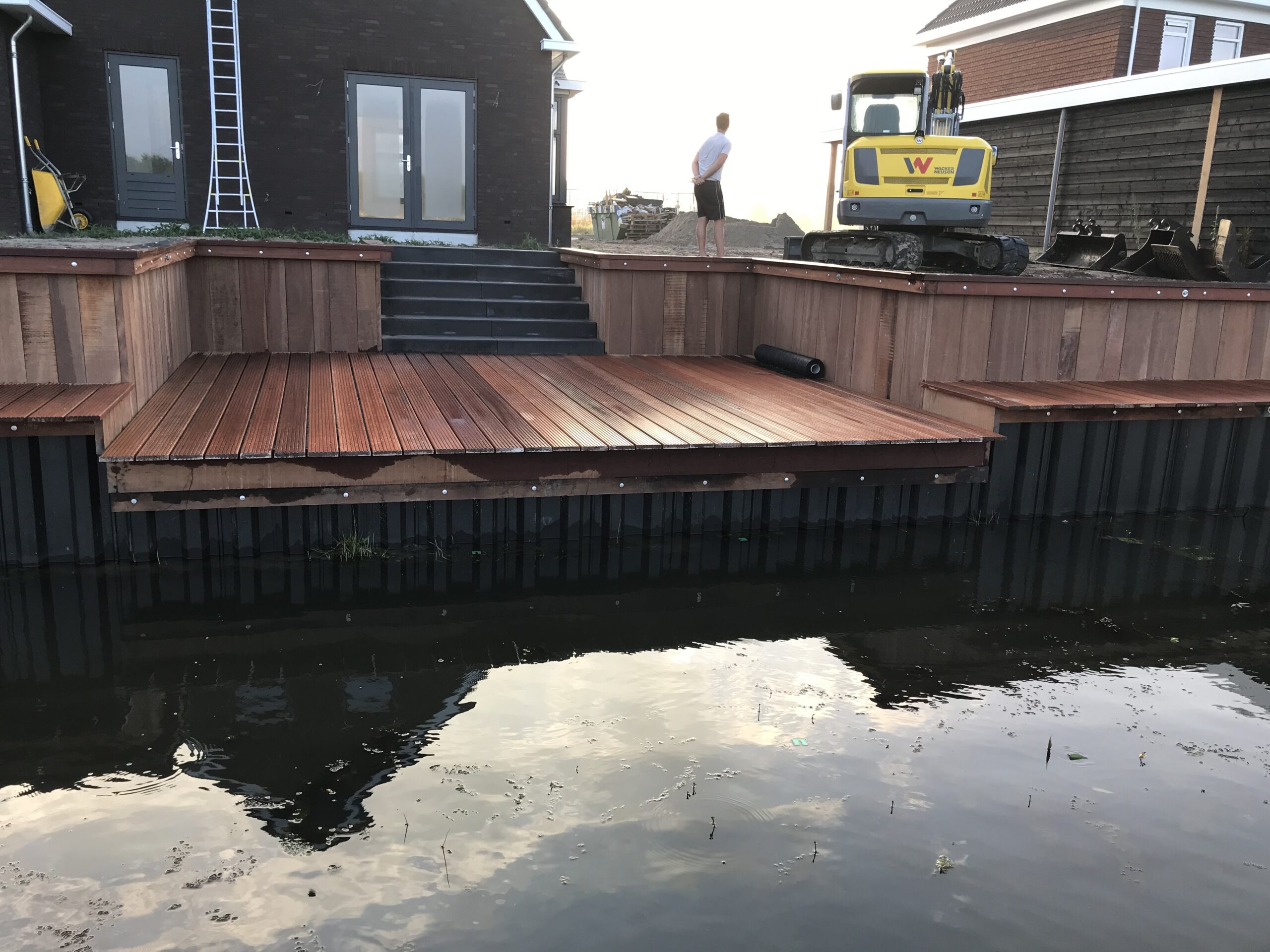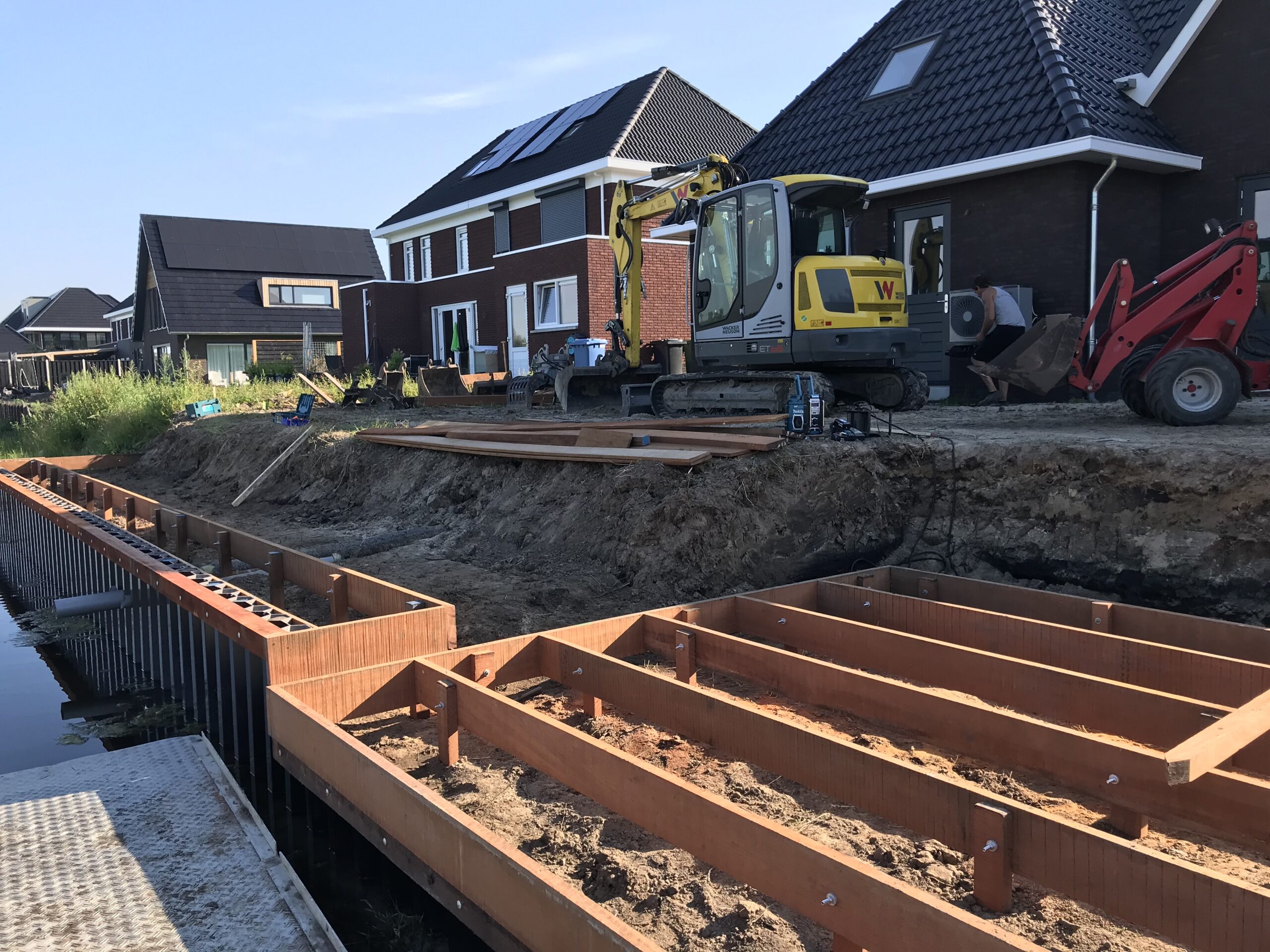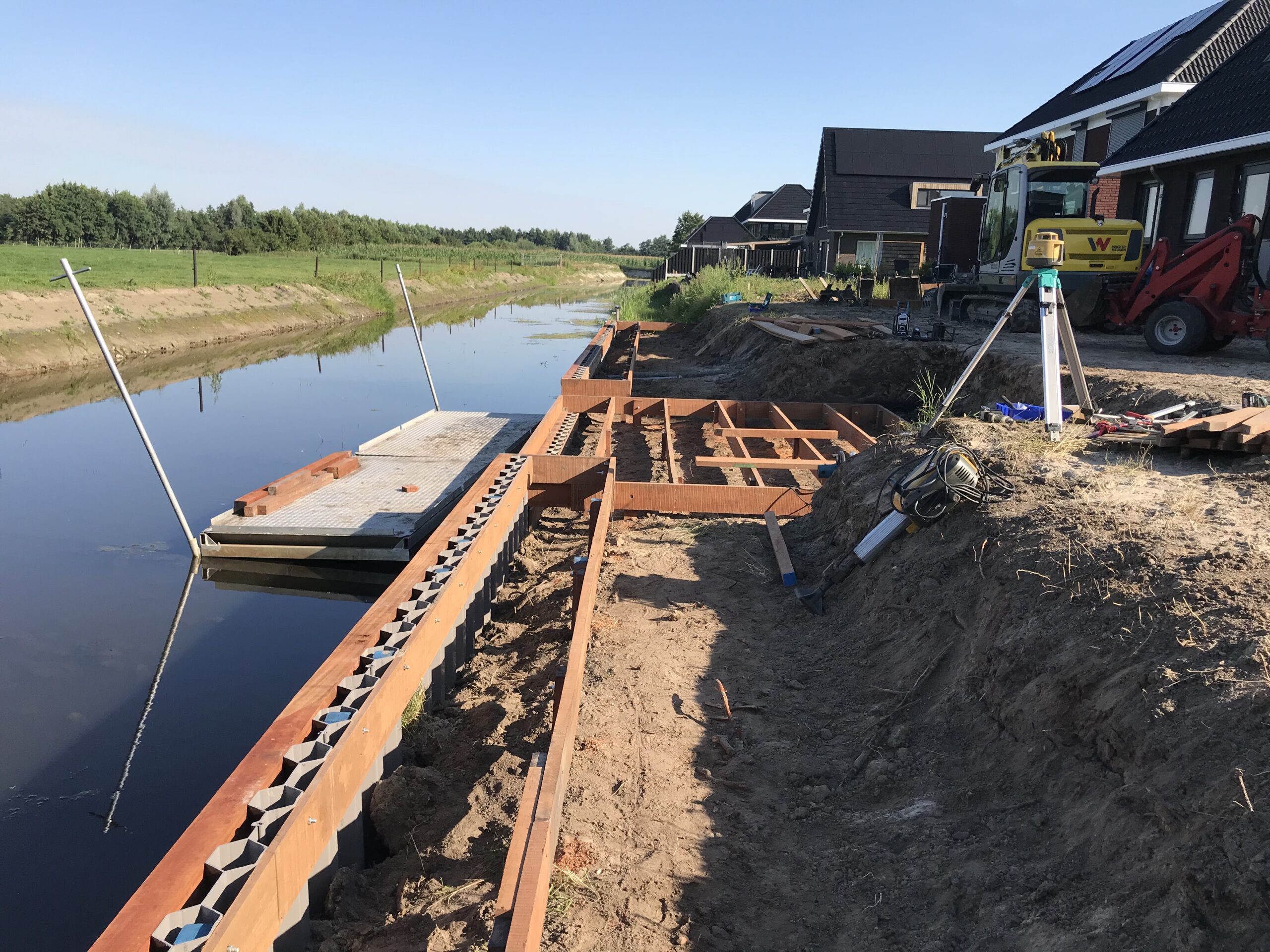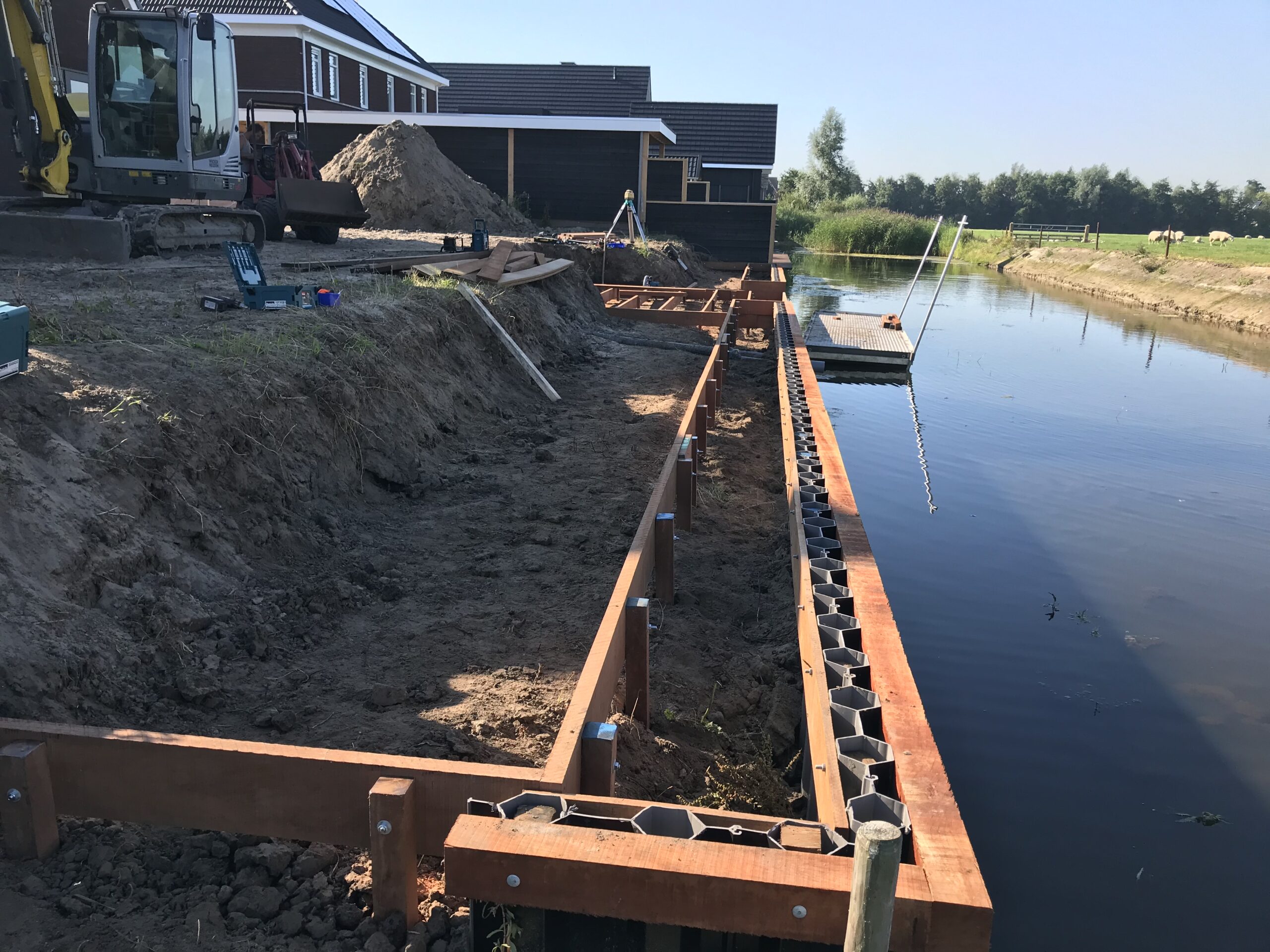 In Heeg hebben we bij een nieuwbouwwoning de oever aangepakt en voorzien van kunststof walbeschoeiing, nog vóór de bouw van de woning begon. Zo werd de kavel optimaal benut en konden de bouwwerkzaamheden daarna sneller en makkelijker verlopen.